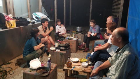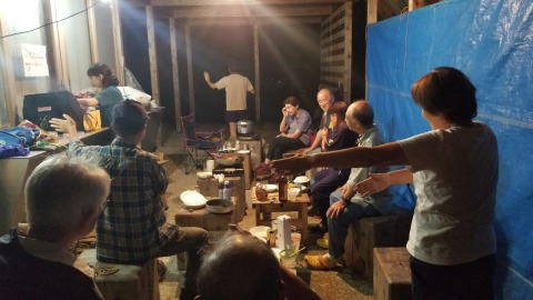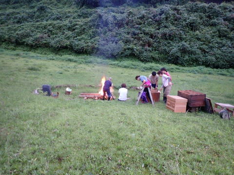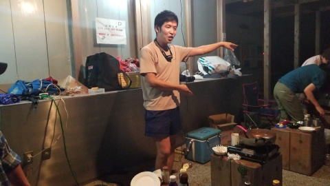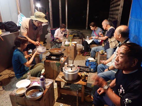 ・17時頃は雨も降らずプファイヤーを焚くことが出来、いざこれから宴会をと思っていたところ雨が降り出し本降りとなり、急遽ビジターセンに避難、ピロティで宴会をすることになった。
