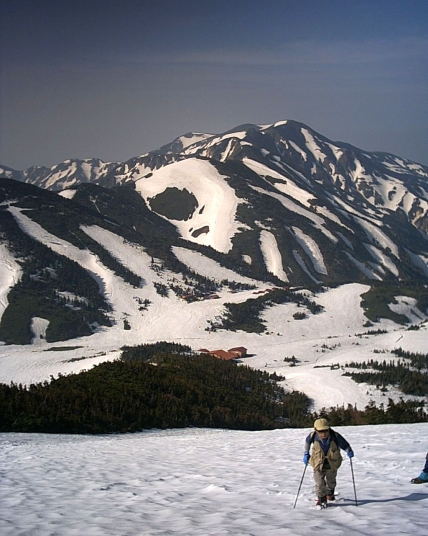 厚い雪に覆われた千蛇ケ池の上を歩いて大汝峰の麓へ。そこは白山の奥の院の様。緑深き平原に“ようこそ”と微笑んで招かれ、暖かく優しく包み込まれたような気分になり、立ち去り難いものがありました。ああ、いいな。また来たいな、きっと来よう。それにしても御前峰、剣ケ峰の後ろ姿のなんと雰囲気の違う事か・・・。
