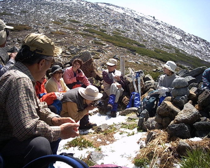 ここで出会ったのが当会の北川女史で、別当から2時間そこそこで来たとの事。われわれの登山スタイルをあたかも否定するがごとき行動ではあるが、まずは感心せざるを得ない。(ヘリの荷にまぎれて・・・なんて事は無いか、ナイヨナ〜)