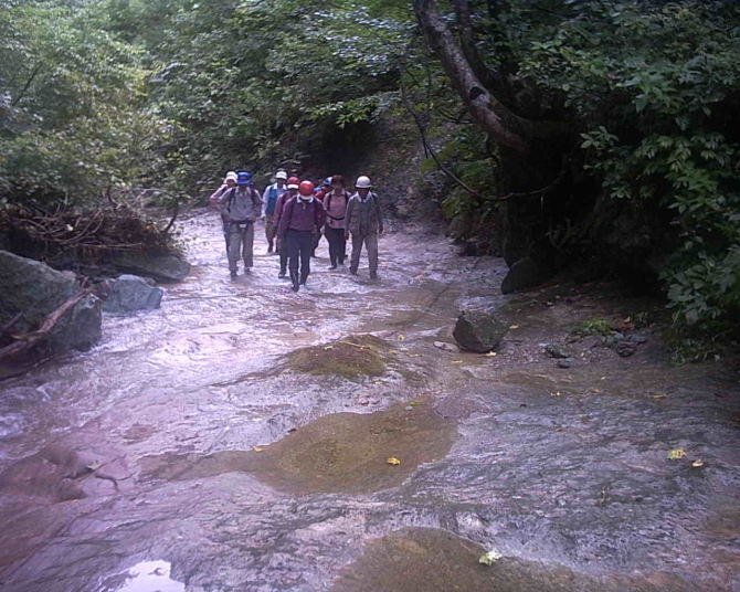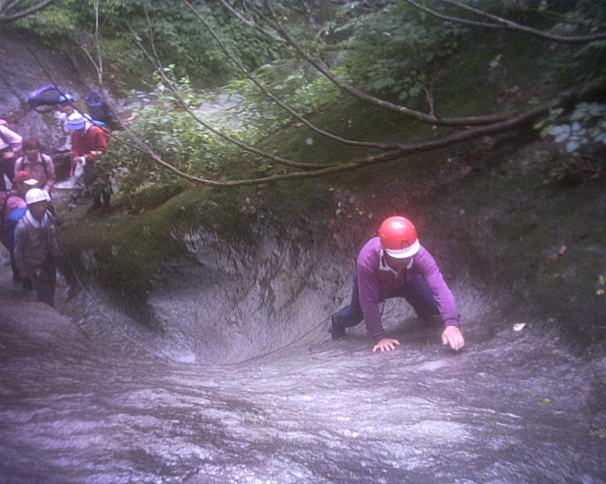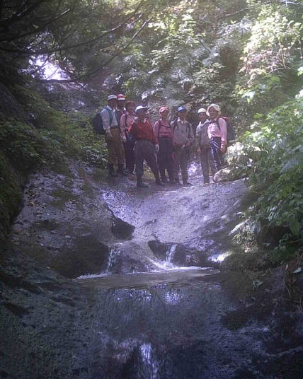 前日の豪雨でわずかに水量は多め、しかし水は澄んでおり期待が持てる。岩はしっかりしており、ヌメリもない。役員会では「あんなの沢登りと言いえるのか?」との意見も聞かれたが、グレードだけが沢の楽しみではない。みんなが行けておのおのが自分流に楽しめる、そんな沢があっても良い。左岸を行けばなんでもない処でも、がんばって右岸をヘツルなんてのもいい。それでドボンしたらなお楽しい。