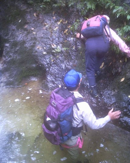 9:30 大池着。三蛇の滝を巻き川床へ。金沢は晴天だったがこちらは薄くガスがかかり、陽射しは強くない。女性3名が沢は未経験との事。