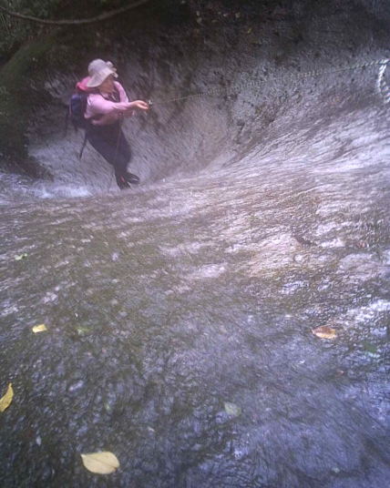 ルートも決めていなかったので、分岐で合議しては遡行をつづけた。岩床、小滝の連続である。高さのあるスラブでは、本田氏がザイルを引きながら直登。そんなリードを要するスラブ、連瀑が上部で3つ。巻くことなく十分楽しみました。