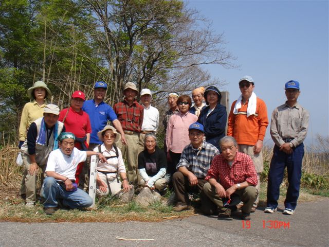 10:10 高州山登山口駐車場着、車道を会長以下全員頂上目指して歩く。新緑が心地よい。